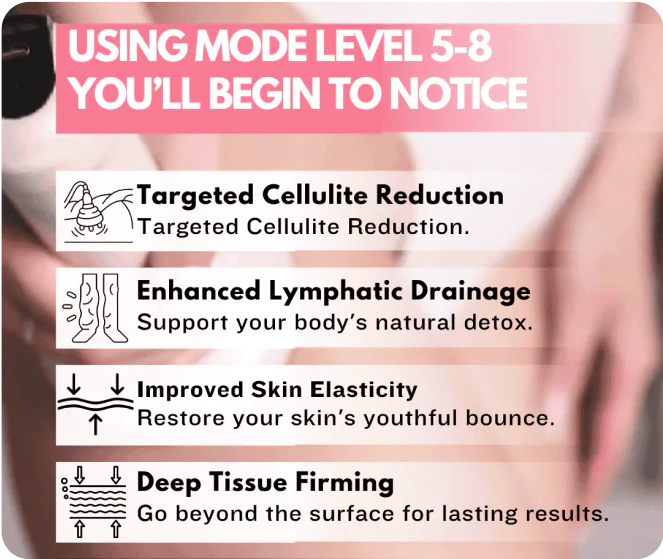 Levels 1 through 4 provide a soothing, light massage—perfect for beginners or sensitive skin. These levels increase circulation, relax the skin, and begin breaking down early cellulite.